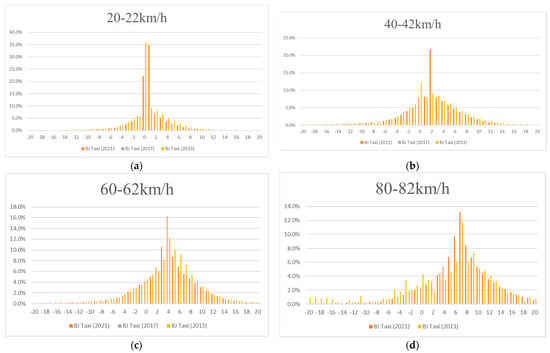 Distribution of VSP bin at the mean velocity interval. (a) VSP distributions of Op mode ID BJ taxi between 20 km/h and 22 km/h. (b) VSP distributions of Op mode ID BJ taxi between 40 km/h and 42 km/h. (c) VSP distributions of Op mode ID BJ taxi between 60 km/h and 62 km/h. (d) VSP distributions of Op mode ID BJ taxi between 80 km/h and 82 km/h.