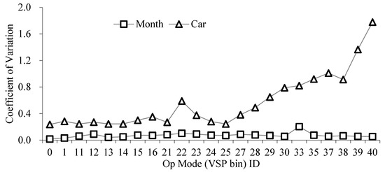 The Coefficient of Variation of the data in each operating mode divided by month and car is calculated, and the results are shown in Figure 5. It is found that the Coefficient of Variation in each operating mode divided by month is very low, which is 7.3% on average. The Coefficient of Variation of a single car is 56.8%. Moreover, the Coefficient of Variation in the high-speed interval (Op Mode ID 33, 35, 37, 38, 39, 40) is more than 100%, and in Op Mode ID 40 is even more than 150%. This reveals that the distribution of the operating mode divided by a single car has high uncertainty in high-speed intervals, which also has a significant impact on the results.