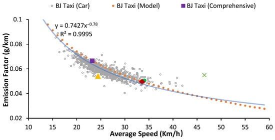 The mean emission rate is a fixed input parameter, in this study, the emission rate of a 2-year-old taxi with China V emission standard will be used. As shown in Figure 6, the final correction data of the mean emission rate is gathered from PEMS test in Beijing taxi.