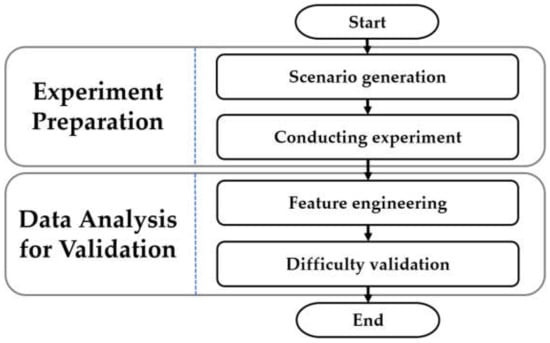 The “Experiment Preparation” section includes the navigation scenario generation for the simulated navigation experiment, and the “Data Analysis for Validation” section includes the maneuvering feature engineering for difficulty clustering.