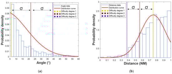 Considering our experiment, this research extracted only two navigation elements: the “course-altering angle” and “straight proceeding distance”. When extracting navigation elements, a 5-min window and five threshold degrees were used to determine whether a ship changed course. After the extraction, the ranges of navigation elements were reduced to a suitable size for our experiment scenarios: a maximum of 60° angle and one nautical mile of distance. Figure 2 shows the navigation elements fitted in probability distribution curves and difficulty degrees.