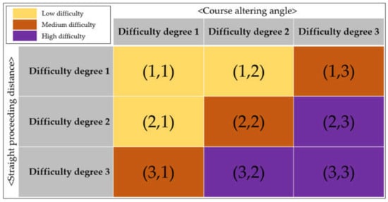 Regarding the proposed concept of difficulty, the low-difficulty scenario has a more minor course-altering angle and a longer straight proceeding distance to the next waypoint, giving trainees sufficient time and place for ship maneuvering along the navigation route. Unlike the low-difficulty, the high-difficulty scenario has a larger course-altering angle and shorter straight proceeding distance to the next waypoint, making the trainees feel challenged to navigate. To determine such difficulty, this research borrowed the “difficulty and importance matrix” concept. Figure 3 shows our proposed difficulty matrix, and Figure 4 shows navigation scenarios in differentiated difficulties for our experiments.