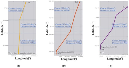 Because this research presupposed that the goal of the experiment is perfect ship maneuvering, participants struggled to maintain the ship’s course and distance on the charted route. Some participants exhibited superb maneuvering, whereas others struggled. Figure 6 shows the ship’s trajectory for three difficulties of navigation scenarios.