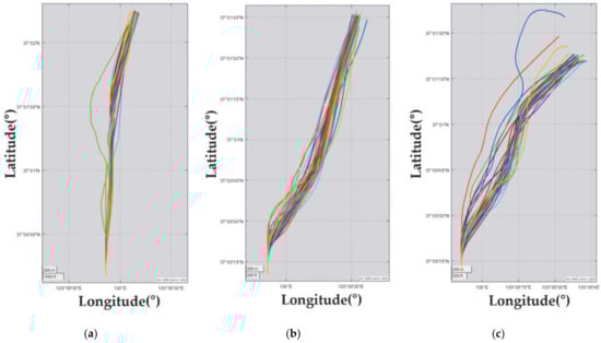 Ship’s trajectory data collected from experiments: (a) low, (b) medium, and (c) high difficulties.