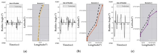 Participant 1’s rudder and ship trajectory results: (a) low, (b) medium, and (c) high difficulties.