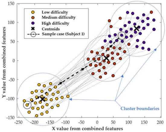 To validate how the differentiated difficulty affected navigation performance, this research first combined selected features into X and Y using the t-SNE clustering algorithm and then compared labeled combined features with k-means clusters. In addition, the lines are connected; subject 1 was described with dots, arrows, and gray colored circles as a representative sample, and additional data was shown to track each participant’s results along the differentiated difficulties in Figure 9.