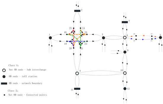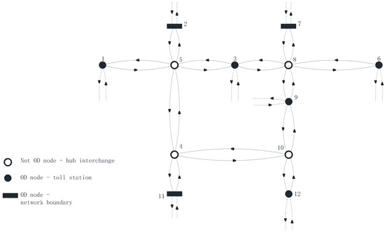 The extension topology is a supplement to the basic topology. The purpose is to more accurately describe the connectivity and the state of the road network. Firstly, the actual traffic network can be affected by traffic events, traffic control or construction operations. This manifests itself on the road network as a local closure of a main road, a closure of an on-ramp, etc. This connection information must be able to be set flexibly on the topology in order to more accurately describe the road network topology for dynamic evolution simulations. In addition, the actual road network is subject to traffic control (speed limit/load limit) and differential decay of component performance. These make the state of some components (bridges/tunnels) or a certain road segment non-uniform in a link in the basic topology. These non-uniform state data need to be stored to describe the state of the road network and serve dynamic evolution simulation more accurately. To address the above situation, the topology is extended with the components or segments as the minimum modeling unit (hereinafter referred to as segments). The added nodes are segment connectivity points. In other words, the non-OD node has the attribute of a connector of two segments in addition to indicating the interchange hub. Figure 2 shows the extended topology of a simple road network.