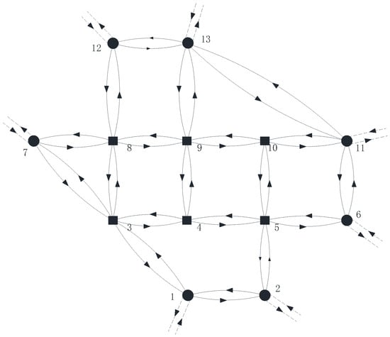 In this section, the Nguyen-Dupuis [19] road network, which is widely used as a case network for research and analysis in transportation, is selected as the physical road network. As shown in Figure 3, there are 38 road sections and 13 nodes in the Nguyen-Dupuis network, among which nodes 1/2/6/7/11/12/13 are OD points.