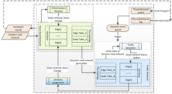 The relationship between road infrastructure performance and road network traffic state interactions is reflected in many studies. On the one hand, road infrastructure performance affects vehicle travel speed and roadway capacity [17]. Through path selection, it affects the traffic volume distribution of the road network. On the other hand, traffic loads act and influence road infrastructure performance. For example, Chen et al. [18] developed an LDE model to predict rutting as a function of structural number (SN), load repetitions, and load intensity. Four test pavements had LDEs higher than 7.8, indicating a significant impact of loading on rutting performance. However, in the actual road network, there is a strong coupling relationship between road infrastructure performance and road network traffic state. First, the road facilities under the irregular use of load and environmental factors show significant differences in performance conditions and decay dynamics. Second, the variability of road facility decay further affects the distribution of traffic load on the road network. We hope to study the coupling mechanism of road infrastructure performance and road network traffic state by establishing a coupled simulation model. The dynamic road network model is the basis of the coupled simulation model, which can both dynamically update and store the traffic indexes and road facility service performance indexes needed for the coupled simulation at the same time.
