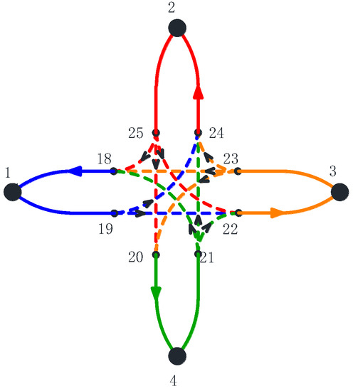 In the GIS platform, the node-link association matrix can be easily and automatically generated by analyzing the topological relationships of geographic entities. The association of attribute information of each road segment can be realized by visual graphical editing and tabular data editing. In MATLAB, the link table (Table 2) and node table (Table 3) can be stored as the Edge and Node of directed graph G to construct static road network models. Functions such as plot(G) were used to complete the visualization of the topology of the Nguyen-Dupuis road network, as shown in Figure 4.