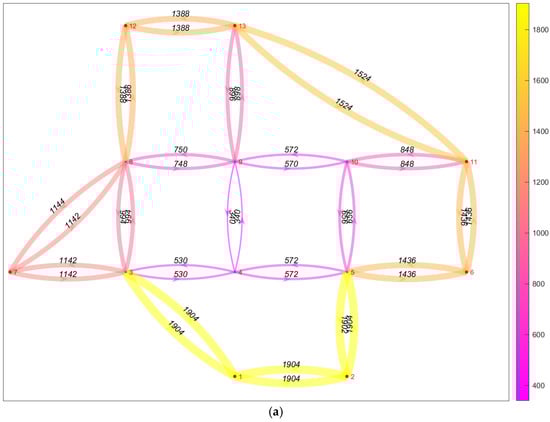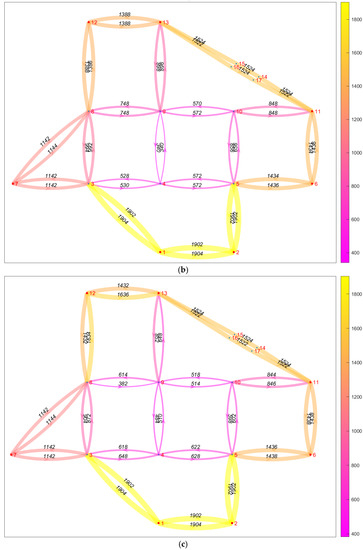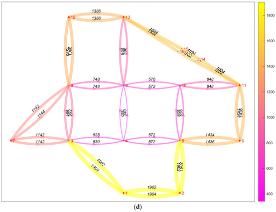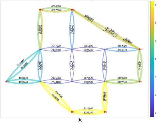 First, Figure 8 shows that links 14 to 15 and links 16 to 17 present the same status in the traffic network, but Figure 9a shows that the annual traffic volume of the road infrastructure in these two links is not the same. The difference between the two is the difference between the traffic network and road infrastructure network under specific traffic control in the real world.