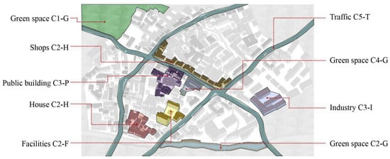 Based on the element organization of spatial forms, the value of the carbon emissions is measured to reflect the level of energy activities in different spatial elements. Specifically, five parts are involved here: carbon basis (C1), carbon boundary (C2), carbon group (C3), carbon node (C4), and carbon corridor (C5) (Table 7). Carbon basis and carbon node mainly refer to the amount of carbon sequestration and storage by the natural environment and the artificial green land within the village-and-town communities; carbon boundary involves the amount of carbon elimination by green land and the emission value of the carbon sequestration of the construction land used for stores along the street; carbon group mainly covers the carbon accounting of the building functional units under the face area form of the village-and-town communities, including the accounting of carbon emissions generated by house groups, industrial buildings, public buildings, supporting buildings, and others amid the production activities and the residents’ daily life. Carbon emissions mainly involve the transportation land in village-and-town communities, specifically reflecting the value of the transportation level during the residents’ life and their daily activities.