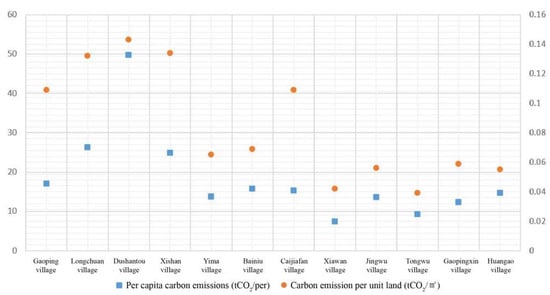 It was found from the overall correlation evaluation analysis that each spatial morphology indicator has a large influence on carbon emissions. The indicators directly impact the spatial structure, the area of built-up area, the building density, and the construction level of village-and-town communities. The higher the construction level of the village-and-town communities, the higher the carbon emissions. The area of built-up area symbolizes the land utilization scale of village-and-town communities. As the land utilization scale increases, more mansions and supporting facilities are built, and the level of activities becomes higher; thus, more carbon is emitted overall. However, in the process of carbon growth, if the carbon emissions in the construction process are controlled, new construction techniques, such as assembly techniques, are adopted, and the energy efficiency can be improved; thus, the overall carbon emissions of the village-and-town communities can be controlled. Two indicators—the homestead coverage rate and the facility coverage—reflect the building density in the village-and-town communities. They directly impact the carbon emissions of the fixed carbon source in the carbon cycle system of the village-and-town communities and play a key part there. The average homestead area and homestead coverage rate are mainly correlated with the industrial nature of the village-and-town communities. It was found from the correlation evaluation analysis in the village-and-town communities of the tourism-led type that the average homestead area and homestead coverage rate are strongly, and positively, correlated with carbon emission intensity. For example, the carbon emissions in Tongwu Village (average homestead area: 328 m2) are higher than those in Gaopingxin Village (average homestead area: 283 m2). It was found from the analysis that the overall scale of land use and the scale of individual use in the spatial form elements have an influence on the carbon emissions of the village-and-town communities to different extents rather than to a large extent.