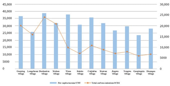 It was found from the overall correlation evaluation analysis that, among the overall information indicators, GDP per capita and population density have a greater influence on carbon emissions, because both GDP per capita and population density directly impact the activity-level energy consumption of village-and-town communities. The GDP per capita represents the economic development of village communities to a certain extent. The economic development of village-and-town communities significantly impacts carbon emission intensity []; it was found from communities of the same industry type that the higher the GDP per capita, the higher the carbon emissions. For example, the carbon emissions amount in Dushantou Village (GDP per capita: CNY 38,721) are higher than those in Xishan Village (GDP per capita: CNY 31,798). Population density represents the spatial capacity of land in village-and-town communities. The higher the number of residents per unit area, the higher the level of behavioral activities. The activity level directly impacts carbon emissions. Energy intensity is an indicator reflecting the energy efficiency and referring to the amount of energy consumed per unit of economic output volume; the lower the intensity, the higher the energy efficiency, and the lower the carbon emission amount. In the low-carbon construction of village-and-town communities, the carbon emissions of village-and-town communities can be reduced by improving energy efficiency and introducing new technologies. From the correlation evaluation of different industry types, the results obtained are similar. Therefore, it can be seen that, whatever the industry type is, GDP per capita and population density impact carbon emission intensity to a certain degree.