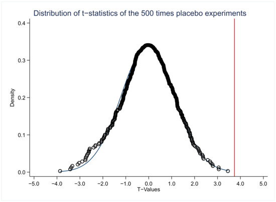 Finally, we conducted a placebo test to provide evidence of the causal relationship between air pollution and employee protection. Specifically, we randomly assigned an AQI index to each city in the sample, created a pseudo AQI index, and used it to re-run the benchmark model. We repeated this process 500 times, obtaining the t-statistics of each regression and drawing the distribution diagram shown in Figure 2. We found that most of the t-values of the pseudo AQI index are near zero and they have a normal distribution, with only a few estimated results being close to or exceeding the real t-value (red line), indicating that some unobserved or time-variable factors will not affect our results.