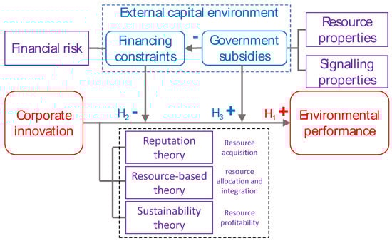 As there is a lack of consensus on the effect of corporate innovation on environmental performance, various moderating and mediating variables are considered in terms of the relevant variables affecting the focal relationship. The relevant literature has focused on environmental and organizational factors. In terms of organizational factors, scholars have used perspectives such as technological dynamism, firm size, corporate image, and organizational learning to conduct their analyses. Yu et al. [11] argued that the positive effects of exploration and exploitation on environmental behaviors are moderated by technological dynamism and firm size, respectively. Ma et al. [12] concluded that corporate image has a long-term mediated role in green-process innovation based on short- and long-term benefits. Tu and Wu [13] revealed the mediation effects of organizational learning in the process of green innovation affecting firms’ competitive strengths. Regarding environmental factors, environmental regulation, group affiliation, and environmental dynamics all influence the focal relationship. Tian et al. [14] studied Chinese listed companies in environment-related industries and found that the enforcement of environmental policies contributed to enhance the positive influence of business innovation on environmental investments. Woo et al. [15] revealed a positive moderating effect of corporate group affiliation and listed the complementary assets of the focal relationship. Chan et al. [16] argued that environmental dynamics moderate the relationship between green product innovation and cost efficiency, with a stronger positive relationship between green product innovation and cost efficiency in highly dynamic circumstances. However, in terms of the amount of resources allocated, each company has budgetary constraints [17], and corporate innovations with high risk and long lead times require high investment budgets; therefore, whether corporate innovation helps to reduce environmental stress is also significantly related to the firm’s external capital environment.