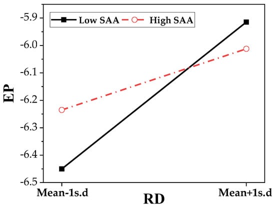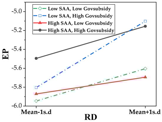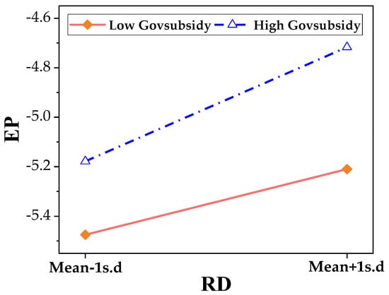 Figure 3 explicitly demonstrates the effectiveness of government subsidy moderation. The increase in environmental performance was higher in the high government subsidies group (environmental performance increased from −5.178 to −4.717) than in the low government subsidies group (environmental performance increased from −5.475 to −5.210), indicating that the higher the government subsidies of the firm are, the greater the positive effect of corporate innovation on environmental performance.