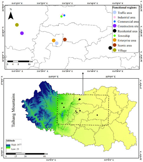 The daily ambient air pollutant concentrations of nine different functional areas in Handan were measured during the COVID-19 period (1 January to 3 March) in 2020, which were conducted by the local monitoring stations at the representative sites (Figure 1). Detailed information about the nine monitoring sites can be found in Table S1.