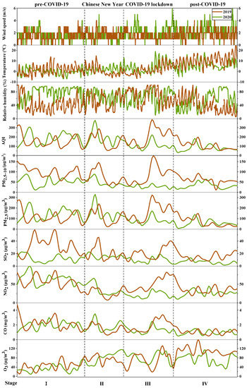For comparison, the corresponding period from 13 January to 16 March 2019 was chosen based on the date of the Chinese New Year in 2019 (5 February 2019, corresponding to the Chinese New Year on 25 January 2020) and correspondingly divided into four stages. This ensured that the impact of human activities on air pollution during the Chinese New Year period was consistent, and the comparison analysis could be more accurate. Moreover, the relation of meteorological factors with the lunar calendar is better than that with the solar calendar, which can reduce the difference in the impact of meteorological factors on air pollution in different years.