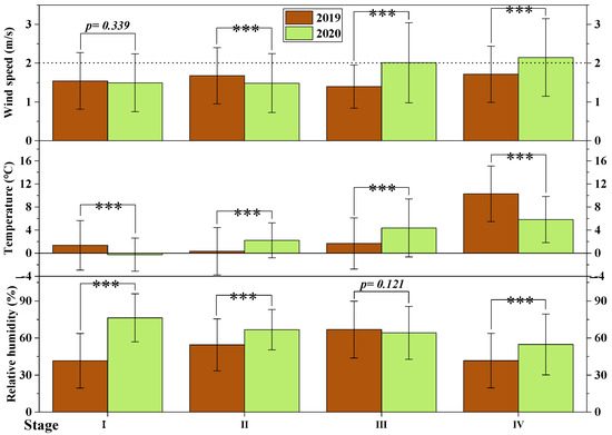 Averages of meteorological parameters in Handan during the COVID-19 period in 2020 and the corresponding period in 2019. The brackets with *** means meteorological parameters have significant differences (independent-samples t-test, p < 0.05) between 2019 and 2020.