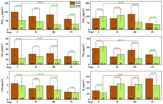 The time series of daily average AQI and concentrations of air pollutants during the COVID-19 period in 2020 and the corresponding period in 2019 are shown in Figure 2, and Figure 5 shows the comparison of the averages of air pollutant concentrations during different stages between 2019 and 2020. As mentioned above, the comparison of air quality data during Stage III of 2019 and 2020 can efficiently reflect the impact of the COVID-19 lockdown (Figure 2 and Figure 5). Compared with during other stages, PM2.5–10, PM2.5, NO2, and CO reduced most significantly during Stage III (COVID-19 lockdown) from 2019 to 2020. PM2.5–10 showed the largest reduction of 66.6%, followed by NO2 (58.4%), SO2 (55.1%), PM2.5 (50.1%) and CO (31.3%). However, compared to Stage III in 2019, O3 increased by 13.9%. These results indicate that the implemented lockdown measures such as quarantine at home and travel restrictions had significant effects on reducing air pollutants, except O3. Secondary formation played important roles in PM2.5 and O3 formation during the COVID-19 lockdown, especially for the haze periods [11,40]. The reduction in PM2.5 and the increase in O3 emphasized the importance of PM2.5 and O3 synergetic control.
