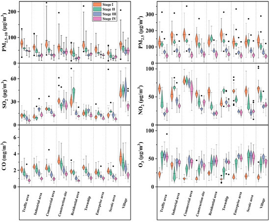 Figure 6 shows the variations in daily air quality at different functional areas in Handan among the four stages during the COVID-19 period. Figure 7 and Table S2 show the changes in air pollutants at different functional areas in Handan during the COVID-19 lockdown period (Stage III) compared with the pre-COVID-19 period (Stage I). PM2.5–10, PM2.5 and CO significantly decreased in all functional areas (Figure 6 and Figure 7, Table S2), but the reduction degree of air pollutants varied among different functional areas. From Stage I to III, both PM2.5–10 (63.7%) and PM2.5 (51.5%) showed the largest reduction in the commercial area, PM2.5–10 reduced the least in the construction site (31.9%) and the village (32.4%), and the minimum decrease (40.6%) of PM2.5 occurred in the scenic area. The different reduction degrees of PM2.5–10 and PM2.5 were caused by the different sources of particulate pollutants in different functional areas. For instance, dust from construction activities and soil dust in the village contributed more to coarse particles (PM2.5–10) [42,52], and the secondary formation of anthropogenic and biogenic precursors contributed more to fine particles in the commercial and scenic areas, respectively.