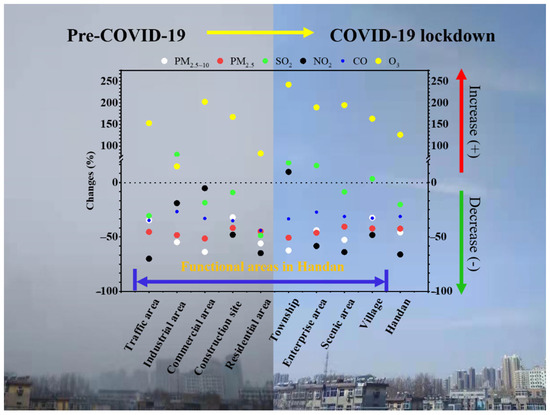 Among different functional areas in Handan, air pollutants showed distinct variation degrees from the pre-COVID-19 period to the COVID-19 lockdown period. Both PM2.5–10 (63.7%) and PM2.5 (51.5%) showed the largest reduction in the commercial area. NO2 showed the largest reduction (70%) in the traffic area. SO2 lowered the most by 48.7% in the residential area but increased greatly by 80.6% in the industrial area. O3 pollution increased in all functional areas to different extents (14.7–242%). These results reflect that the sources of air pollutants in different functional areas are different, so it is necessary to formulate air pollution control measures according to functional areas.