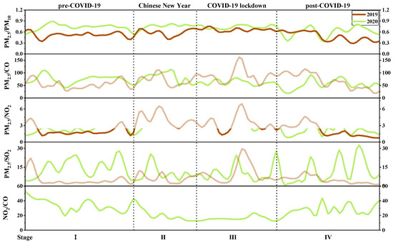 The PM2.5/CO ratio is used as a good indicator of primary combustion sources [61]. A higher PM2.5/CO ratio suggests a more important contribution of secondary formation to PM2.5 than primary emission. The PM2.5/CO ratio decreased from 72.7 during Stage I to 62.0 during Stage III, and PM2.5/SO2 also slightly decreased from 13.9 to 10.6 (Figure 8), but the correlations between PM2.5 and CO, SO2 became more significant (Table 1). These results suggest that stationary sources such as industrial emissions played an important role during the COVID-19 lockdown period. In contrast, PM2.5/NO2 increased from 2.2 to 4.0 (Figure 8) and their correlation became weaker (Table 1), while NO2/CO reduced largely from 34.5 to 16.1. These results imply that the COVID-19 lockdown measures led to a much more significant reduction in NO2 and CO from mobile source emissions in Handan [55].