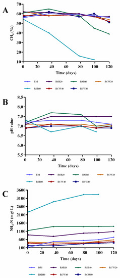 The methane concentration (% v/v CH4) in biogas samples remained above 54% during the experiment, except for the RSB40 biodigester that declined the methane concentration from the 36th day of anaerobic co-digestion, reaching a concentration of 40% methane. The RSB80 biodigester declined from the start process of anaerobic co-digestion and stopped biogas production on the 99th day (Figure 2A).