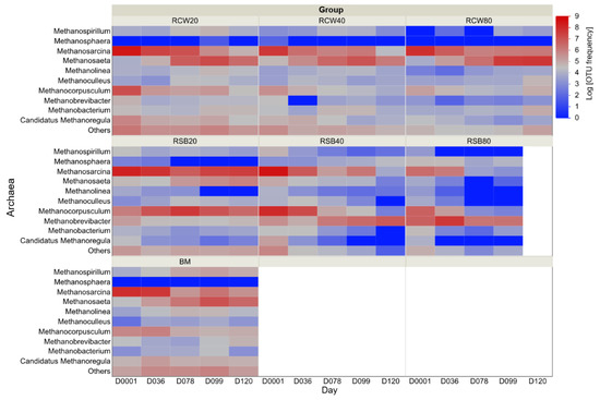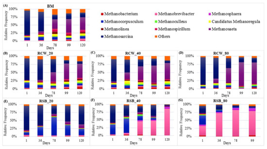 In this case, it was not possible to stipulate what was the exact propulsive pathway for methanogenesis from the 78th day on the BM biodigester, although it is believed that acetogenesis may have prevailed, based on the high abundance of the Methanosaeta genus. It was also noted that the RCW archaeal microbiota was quite similar to that found in the BM biodigester (Figure 3A–C). The relative abundance of Methanosarcina on the first day of anaerobic co-digestion phase was 66% for RCW20, 66% for RCW40, and 83% for RCW80.