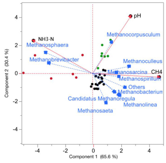 Association between the physicochemical variables and the relative abundance of OTUs, classified at the genus level. The physicochemical variables included in the PCA plot are the values of CH4 (% v/v), NH3−N concentration (mg/L), and pH.