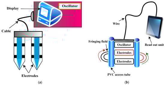 The capacitance sensor and FDR estimate a medium’s dielectric constant (Figure 5a,b) by determining the charge time taken by a capacitor in that medium [91,92,93]. Due to this reason, the method outcome is very soil specific and requires frequent calibration at the time of implementation. The cost for the initial setup is relatively lower than that of TDR.