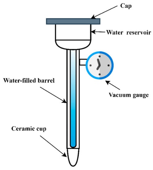 A tensiometer is a primary instrument to determine the matric potential of soil (Figure 7), which is often referred to as based on principles of negative pressure (soil water tension) or soil water suction [49,97,98]. A tensiometer works only in the range of 0–1, which captures only a small portion of the entire range of available moisture. These limitations in in-depth coverage cause an inaccurate estimation of the wilting point of moisture for most crops. The technique is preferred mainly in sandy soil where moisture usually lies at a depth of fewer than 1 m but is discarded in fine-textured soil. Despite the cost-friendly and easy installation, it demands regular maintenance and is destructive in nature [98].