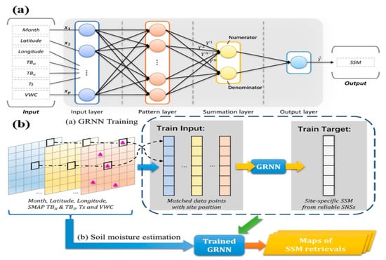 - Yuan, Q.; Xu, H.; Li, T.; Shen, H.; Zhang, L. Estimating Surface Soil Moisture from Satellite Observations Using a Generalized Regression Neural Network Trained on Sparse Ground-Based Measurements in the Continental US. J. Hydrol. 2020, 580, 124351. [Google Scholar] [CrossRef]