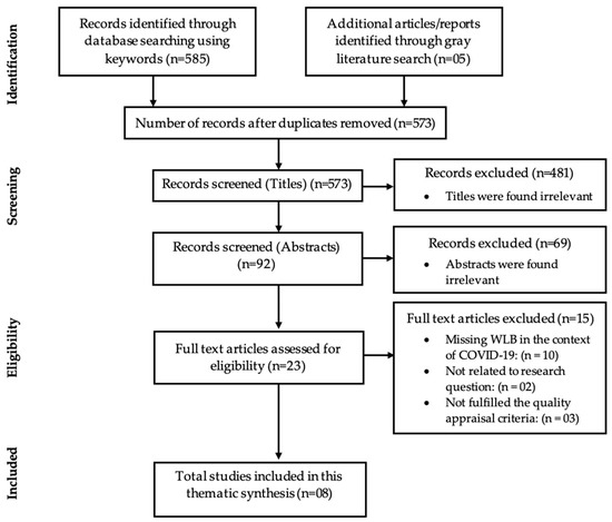 Quality appraisal of the selected studies is essential for addressing the risk of bias in individual studies to establish validity and reliability before progressing to further stages in the SLR process [89]. The reviewers excluded the studies if they did not meet the quality appraisal criteria. We assessed the studies according to 12 criteria adopted from Thomas and Harden’s [79] sensitivity analysis. Five criteria deal with reporting aims of the study, context, rationale, methods, and finding (e.g., was there an adequate description of study aims, sample selection, and the context?). The other four criteria related to the validity and reliability of the research process and the adequacy of the strategies applied to ensure the validity and reliability of research instruments, methods of data analysis, and the validity of findings (what techniques have been employed to establish the validity of findings?). The last three criteria concerned the assessment of the suitability and appropriateness of the research methods for verifying the findings in the primary studies. For instance, were the findings to maintain WLB during a pandemic depicted participants’ perspectives in the form of quotes? Similarly, were the data collection methods in the primary studies appropriate for helping teachers and health care workers to narrate their experiences of WLB during COVID-19? As a result, three studies from gray literature were excluded from the quality appraisal process because of the lack of methodological rigor and the absence of clarity in the findings. Finally, eight studies comprising seven from the education and health sectors and one multidisciplinary research report met the inclusion and quality appraisal criteria and were included for synthesis (Appendix A Table A1). Booth [90] also suggested including 6 and 14 studies for qualitative research synthesis that could maintain insight and obtain sufficient familiarity with the phenomenon of interest. The literature search process based on PRISMA protocol is illustrated in Figure 1.