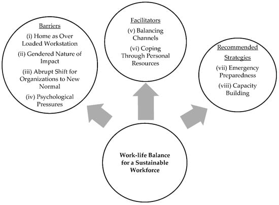 The findings of the review were organized into eight interrelated analytical themes reflecting barriers, facilitators, and recommended strategies for maintaining the WLB during and after COVID-19. The themes included (i) home as over loaded workstation; (ii) gendered nature of impact; (iii) abrupt shift for organizations to new normal; (iv) psychological pressures; (v) balancing channels; (vi) coping through personal resources; (vii) emergency preparedness; (viii) capacity building (Figure 2). The results comprised a definition of each theme, data from the descriptive themes, and illustrated by supporting direct quotes extracted from the reviewed articles [75,76,99,100,101,102,103,104]. Findings are vigorously presented along with relevant quotations from primary studies to enhance the transferability of findings to other settings and groups, as highlighted by Guba [98]. Moreover, the findings revealed most of the data from working women who faced challenges and tried to maintain WLB during COVID-19. The details of the themes are mentioned in Figure 2: