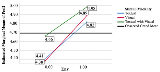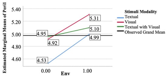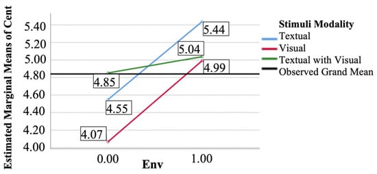 In Figure 3 and Figure 4, we show that the EMMs of peripheral processing based on attractiveness (EMM = 4.53, M = 4.33, SD = 1.21) and peripheral processing based on effortless processing (EMM = 4.41, M = 4.43, SD = 1.38) for the textual modality were less than 4.55 (EMM of central processing) when the involvement with environmental issues was low. Similarly, when the involvement with environmental issues was high, the EMM of peripheral processing based on attractiveness (EMM = 4.99, M = 5.00, SD = 1.30) and peripheral processing based on effortless processing (EMM = 4.82, M = 4.82, SD = 1.18) for the textual modality were less than 5.44 (EMM of central processing). These results further indicate that, irrespective of the level of involvement with environmental issues, the textual modality increased the central processing of the user-centric advertisements, corroborating H1.