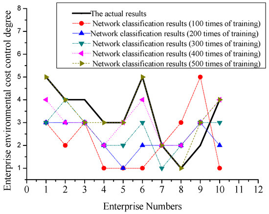 Figure 4 shows the test results of the environmental protection control level of the enterprise after training the same probabilistic neural network with the same parameters 100 to 500 times.