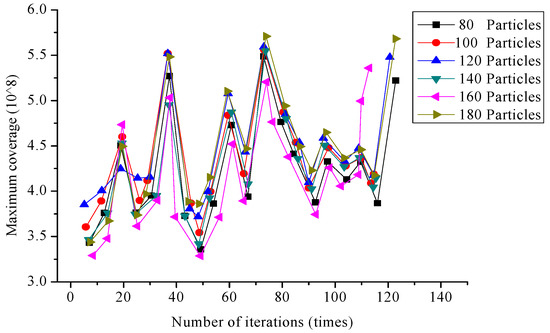 Figure 6 illustrates the changes in the maximum coverage and the number of particles and the number of iterations.