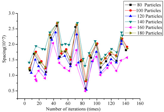 Figure 7 shows the changes in the spacing and the number of particles and the number of iterations.
