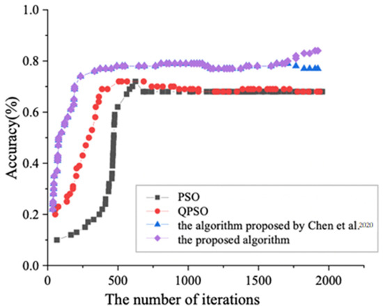 In order to better test the performance of the algorithm proposed, this research tests and compares the proposed algorithm with the classical PSO algorithm, QPSO (Quantum particle swarm optimization algorithm) algorithm, and the algorithm proposed by Chen et al. in the machine learning database proposed by the University of California, Irvine. In the PSO algorithm, , the weight coefficient gradually decreases from 0.9 to 0.3, the number of particles is 40, and the algorithm iteration number is 4000 times. The expansion and contraction coefficient of the QPSO algorithm gradually decreases from 1 to 0.6, the number of particles and iterations of the algorithm proposed is the same as that of the PSO algorithm. The parameter setting of the algorithm proposed by Chen et al. is 40 particles and 4000 iterations. The parameter setting of the algorithm proposed is the same as that proposed by Chen et al. The performance comparison results of the four algorithms are shown in Figure 10.