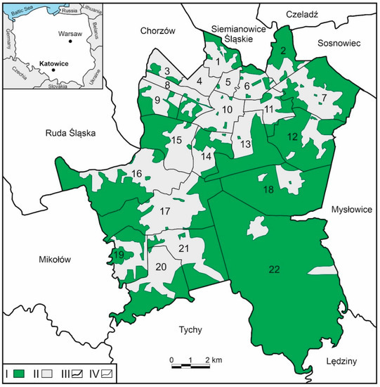 Administrative districts of the city of Katowice: 1—Wełnowiec-Józefowiec; 2—Dąbrówka Mała; 3—Osiedle Tysiąclecia; 4—Dąb; 5 Koszutka; 6—Bogucice; 7—Szopienice-Burowiec; 8—Załęzie; 9—Osiedle Witosa; 10—Śródmieście; 11—Zawodzie; 12—Janów-Nikiszowiec; 13—Osiedle Paderewskieg;—Muchowiec; 14—Brynów Część Wschodnia—Osiedle Zagrzebionka; 15—Załęska Hałda—Brynów Część Zachodnia; 16—Ligota-Panewniki; 17—Piotrowice-Ochojec; 18—Giszowiec; 19—Zarzecze; 20—Podlesie; 21—Kostuchna; 22—Murcki. I—green areas; II—built-up areas; III—boundaries between cities; IV—boundary of administrative districts. Source: own elaboration.