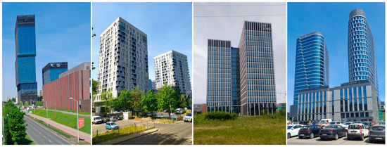 Some emblematic examples of modern architectural projects in Katowice from the early 2020s, from left to right: KTW II, Sokolska 30 Towers, CitySpace Face2Face, and Global Office Park. Source: authors.