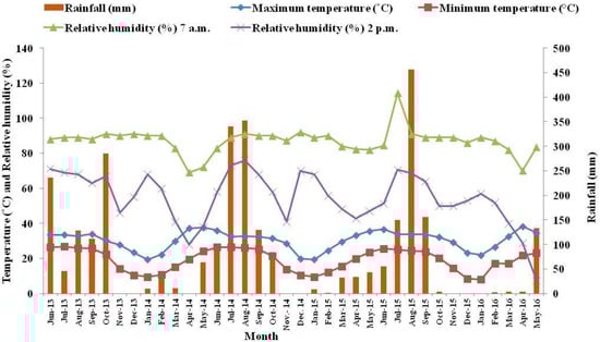 The present trial was conducted at the research farm of Dr. R. P. Central Agricultural University, India. The experimental site was located at the southern bank of the Burhi Gandak river (N 25°58′43.3″ and E 085°40′24.5″ and 52.3 m above the mean sea level). At this location, the climate is sub-humid sub-tropical. It falls in the south-west region and the monsoon, generally, starts from the middle of June and continues up to the first week of October. The annual average rainfall is about 1200 mm, and more than 80% is received during June and October. The weather data (e.g., rainfall, the minimum and maximum temperatures, and relative humidity) for the crop seasons (Kharif-2013 to Rabi-2015–16) are presented in Figure 1. The soil status of the experimental field is depicted in Table 1.