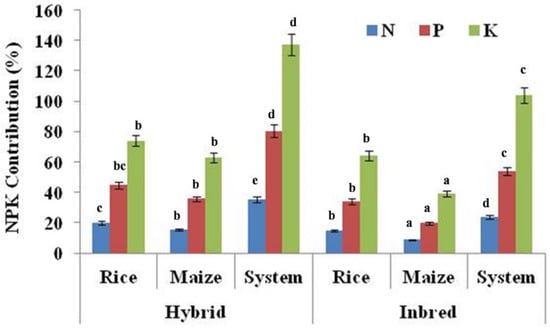 Among different nutrients, the maximum % contribution of potassium from the available soil nutrients towards total uptake by both the hybrid and conventional crops was observed followed by phosphorous and nitrogen. The nitrogen, phosphorous and potassium contributions from the available nutrients towards total uptake by the hybrid rice–maize system was more than the conventional rice–maize system (Figure 2). The contributions of the nutrients from soil is governed by different factors, viz., the soil environment, type of crop, rooting pattern, etc. The nutrient contribution from the soil was more in the hybrid crops than the conventional crops and that might have been due to better root growth, leaf area and nutrient translocation in the hybrid crops. Prasad et al. [42] studied the nutrients contribution towards the total crop uptake for development of target yield equation and recorded the maximum contribution of potassium followed by phosphorous and nitrogen in rice, while in maize, it was the maximum for phosphorous followed by potassium and nitrogen. This variation in the soil contribution towards a total uptake might have been due to variations in the crop type and soil environment.