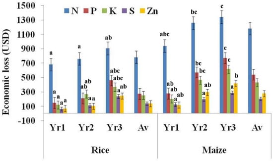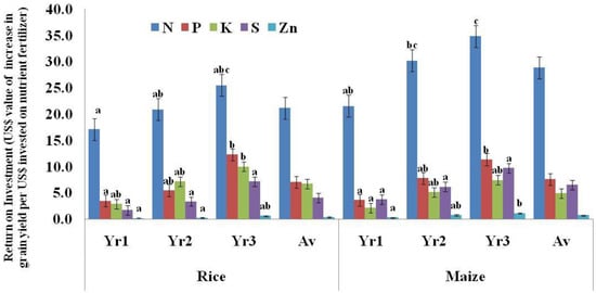 The economic loss in both the hybrids due to nutrient omission was lower during the first year and it was found to increase during the subsequent years (Figure 4). More economic loss during the second and third years was due to a higher yield loss under the regular omission of a nutrient. The economic loss due to the omission of nitrogen was higher than the other nutrients and this shows that nitrogen plays a more crucial role for crop yields than do the other nutrients [9,12]. The economic loss in the hybrid maize was more as compared to the hybrid rice, which might have been due to a higher economic yield and higher loss due to the nutrient omission in the hybrid maize rather than the hybrid rice. Likewise, the return on investment (ROI) (i.e., USD per USD invested in nutrient fertilizer) was more for the N-omitted plot followed by phosphorous, potassium, sulphur and zinc. In on-farm experiments at different locations in India, the blanket recommendation of fertilizer nutrients causes more economic loss than a balanced management of nutrients [71].