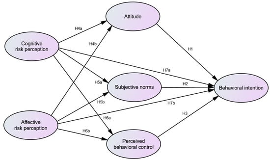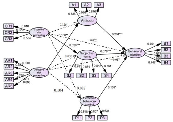 Next, SEM was used to conduct verification (Figure 2). The model fit indices for the structural model were RMSEA = 0.072, CFI = 0.909, NFI = 0.874, TLI = 0.894, demonstrating a good fit to the data. Cognitive risk perception exhibited a significantly positive influence on subjective norms (β = 0.320, p < 0.001), supporting H5a, but it did not show significant effects on attitude and perceived behavioural control, rejecting H4a and H6a. Affective risk perception exhibited a significantly positive influence on attitude (β = 0.188, p < 0.01), supporting H4b, whereas it did not affect subjective norms and perceived behavioural control, rejecting H5b and H6b. Both cognitive risk perception and affective risk perception had no significa-nt positive influence on behavioural intention, rejecting H7a and H7b. Attitude, subjective norms and perceived behavioural control had positive influences on behavioural intention (β = 0.204, p < 0.001; β = 0.678, p < 0.001; β = 0.103, p < 0.05), supporting H5, H6, and H7 (Figure 2).