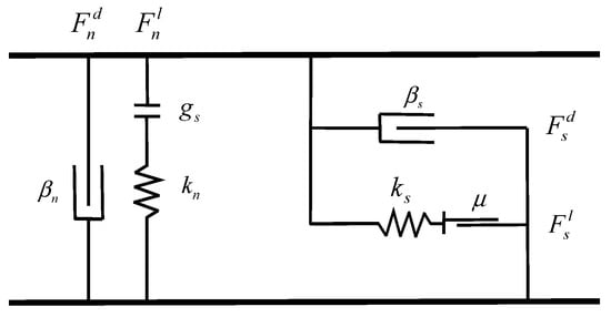 Many constitutive models in the discrete element method can be used to simulate different materials. This paper selects the linear model and linear contact bond model to construct the aggregate–wheel model. The structure of the linear model is shown in Figure 1. The normal force in the linear model can be described as: