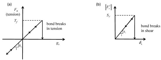 Force–displacement law for the linear component of the bonded linear contact bond model. (a) Normal force versus surface gap; (b) Shear force versus relative shear displacement.