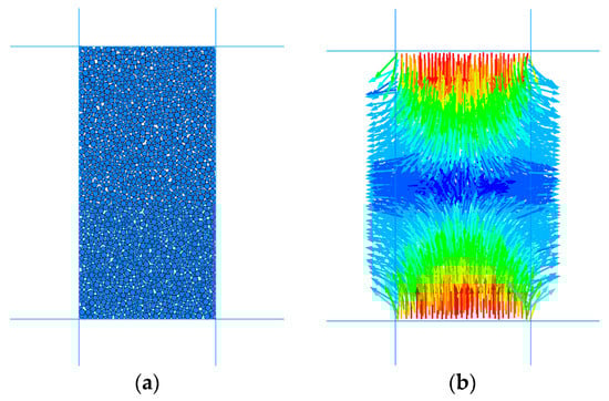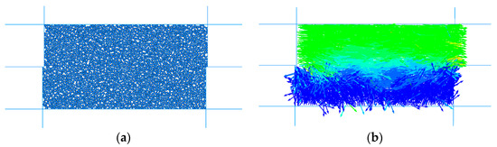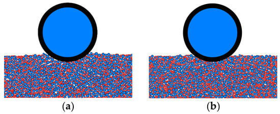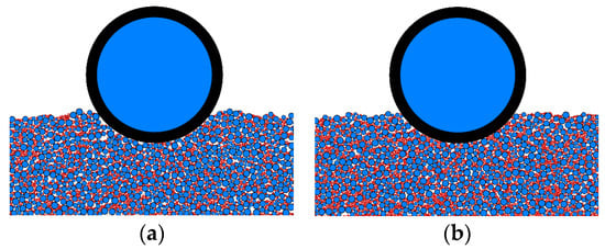 The number of particles in the full-size aggregate model is too large. In order to reduce the amount of calculation, this paper refers to the slave area algorithm in reference [] to generate the whole segment of aggregate. The specific process is as follows: (1) According to the calculation capacity and efficiency of our computer, we choose to generate 5 m-long aggregates first. When the wheel reaches the midpoint of the aggregate, the program is suspended and the data information such as the position, speed, and contact of the model at this time is saved. (2) Then, generate the next equal length aggregate, and continue the procedure when the contact force of the next segment of aggregate particles is balanced. (3) Finally, after the wheels reach the next aggregate section, the program is suspended, the previous aggregate section is deleted, and the next aggregate section is generated simultaneously. Cycle this operation until the end of the simulation process.